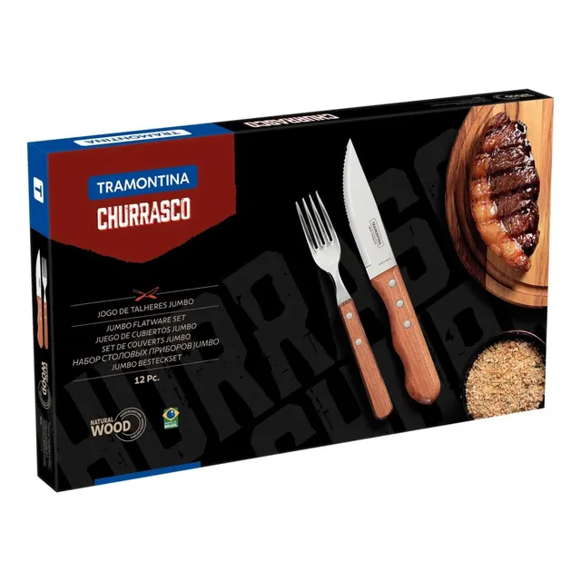 O Jogo de Talheres para Churrasco Tramontina Jumbo Dynamic 12 Peças é perfeito para quem valoriza qualidade, conforto e estilo à mesa. Produzidos com lâminas em aço inox e cabos de madeira natural, os talheres oferecem durabilidade, resistência e excelente desempenho de corte.